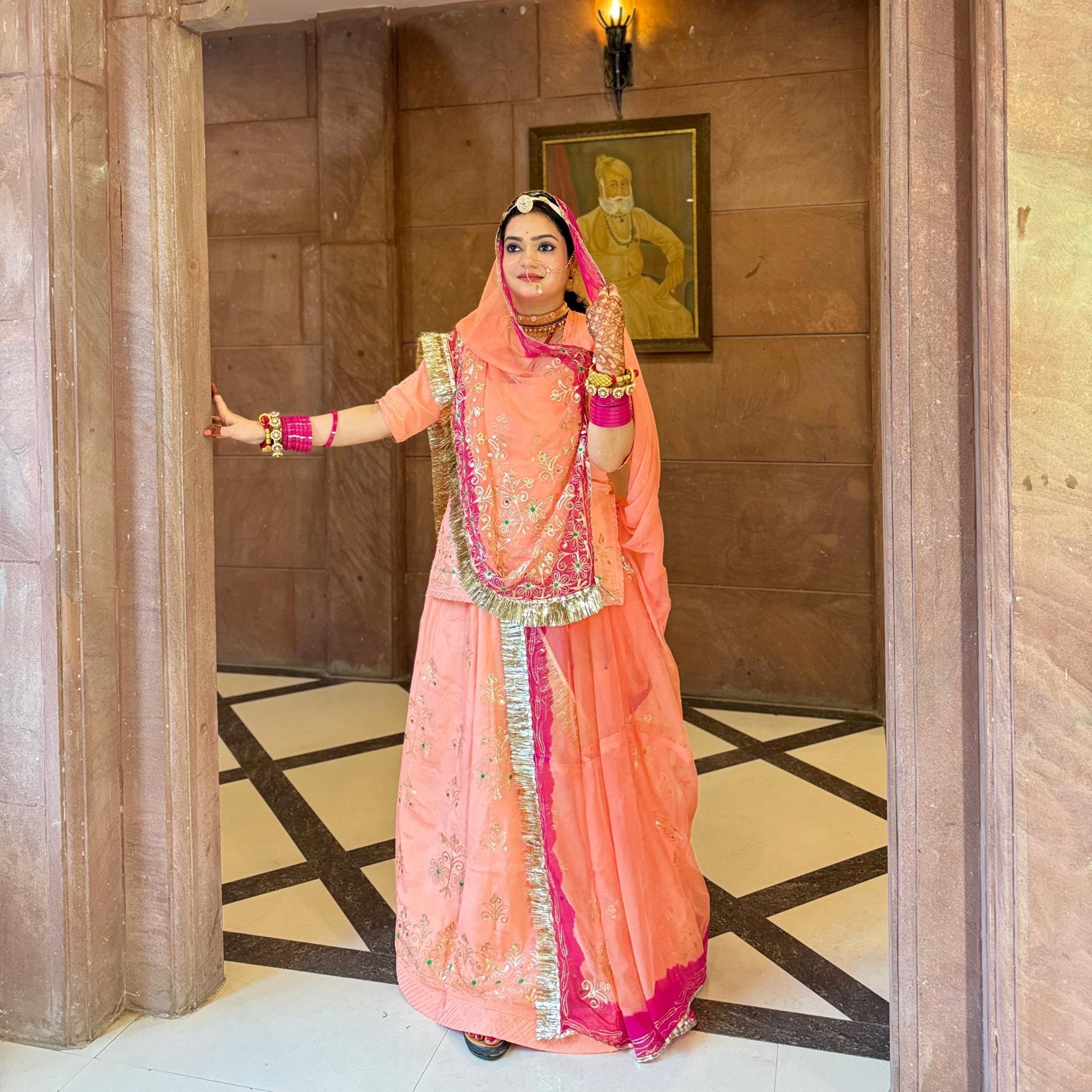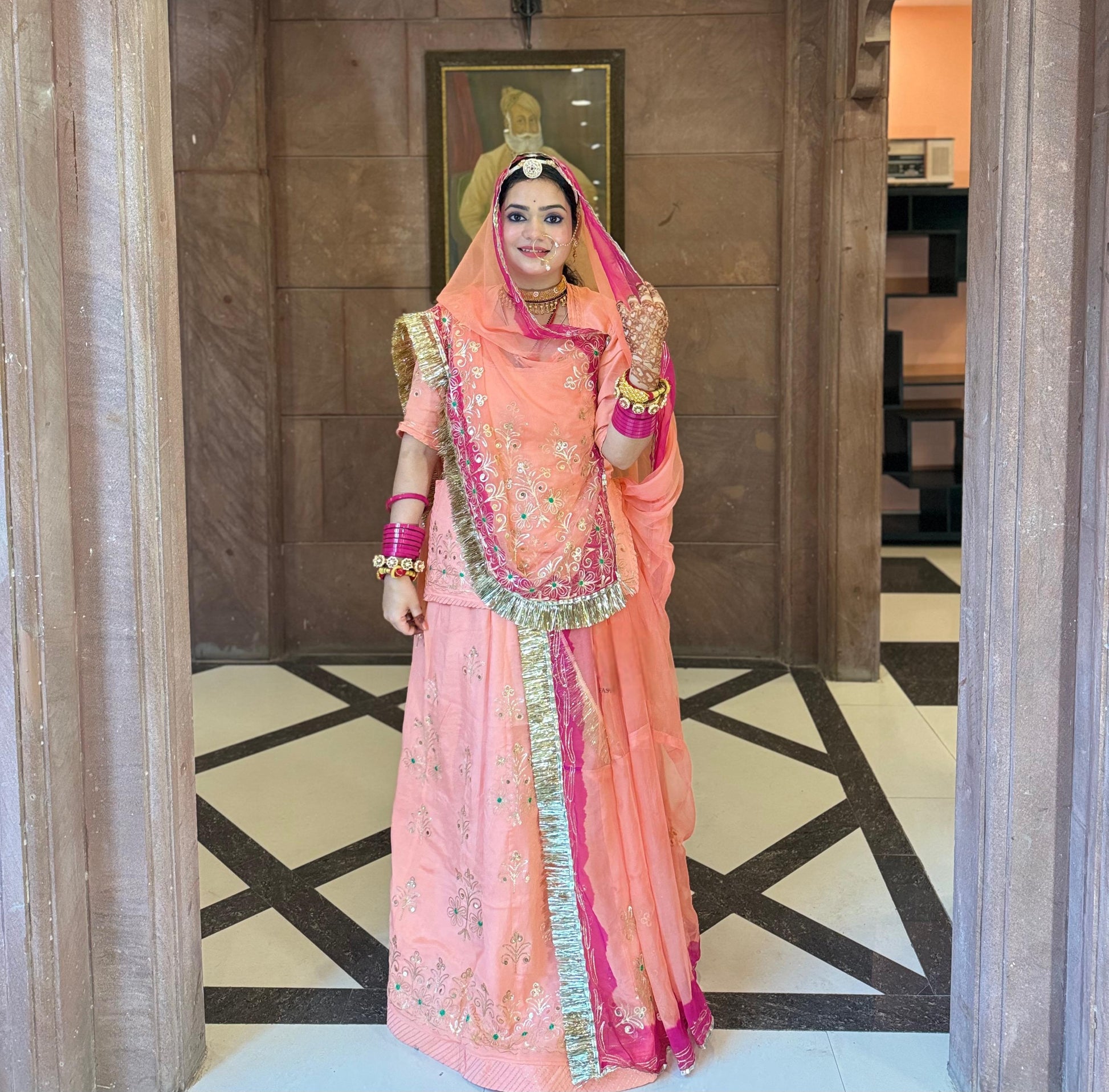 Elegant Partywear Rajputi Poshak | Upada Fabric, Kasab, Kundan & Resham Handwork