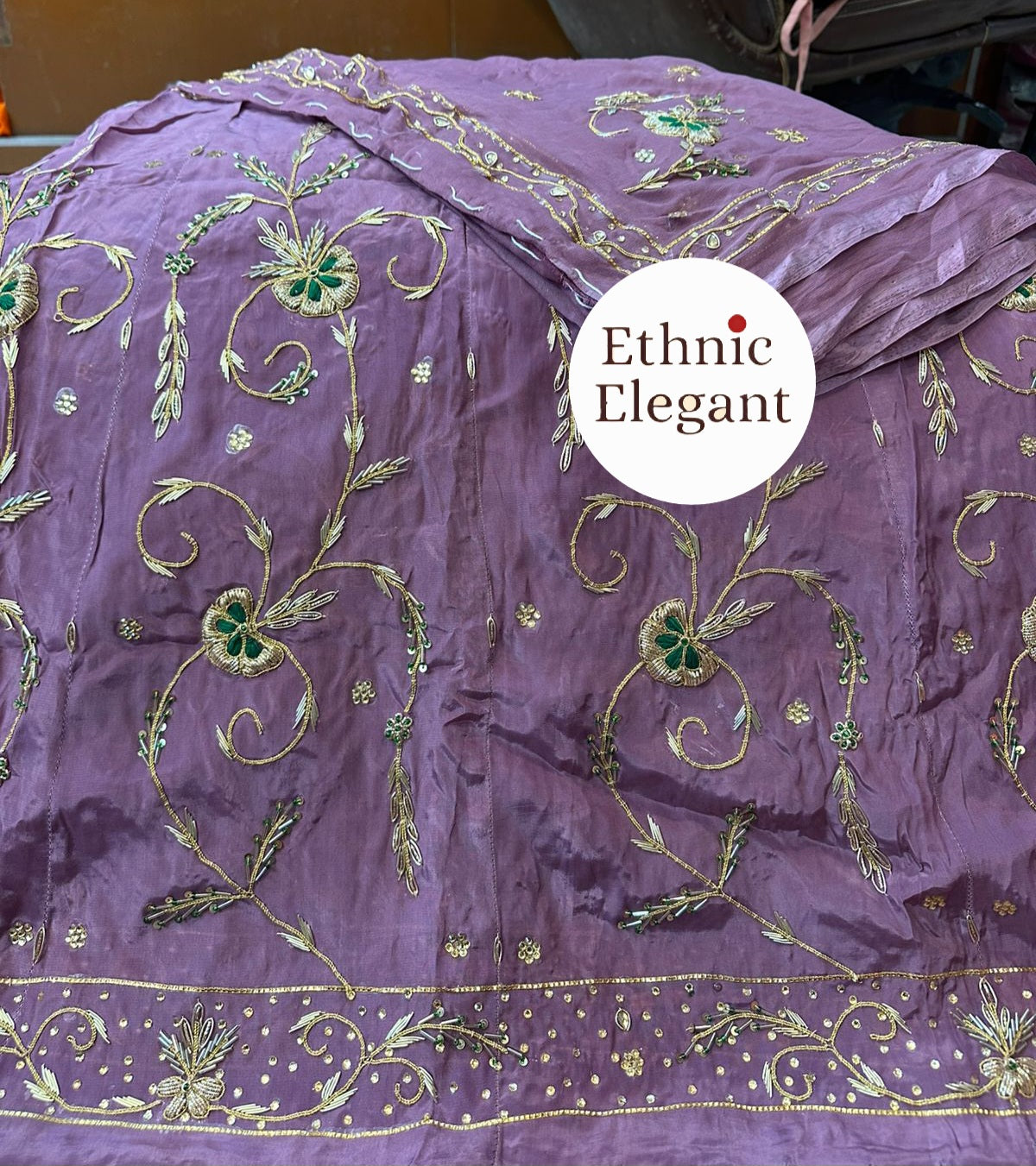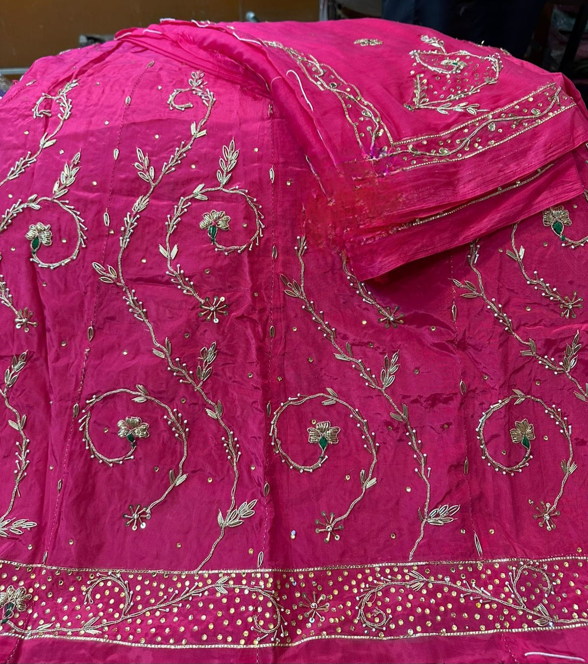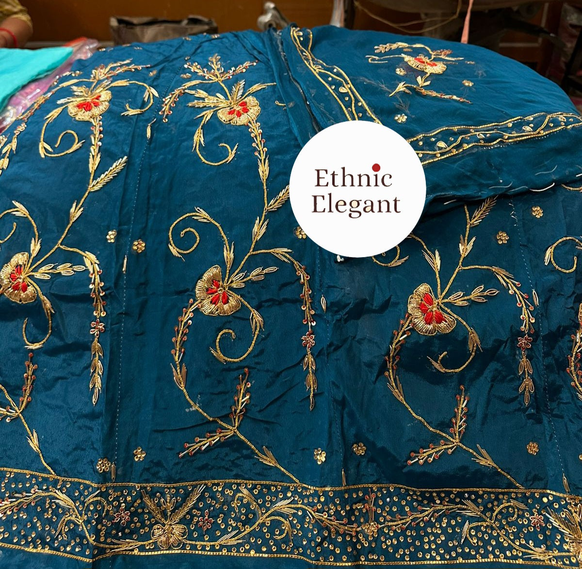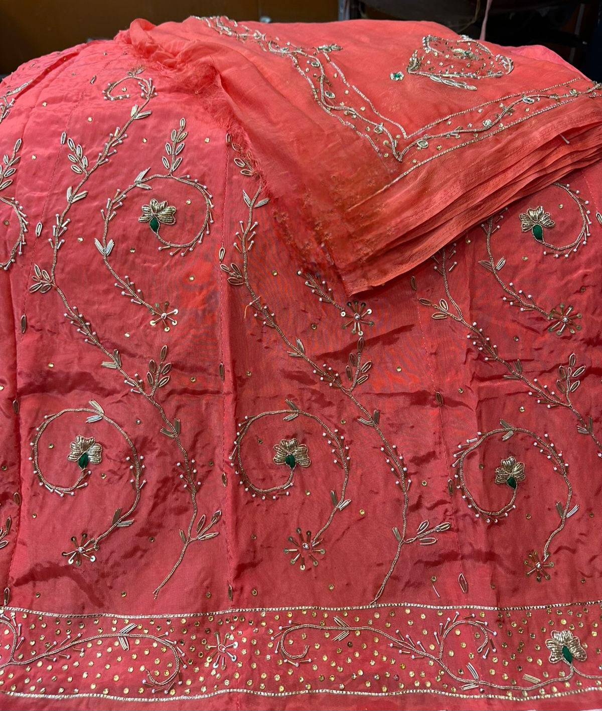Handwork: Beautiful and heavy handwork featuring traditional Jardoji and Dabka techniques.