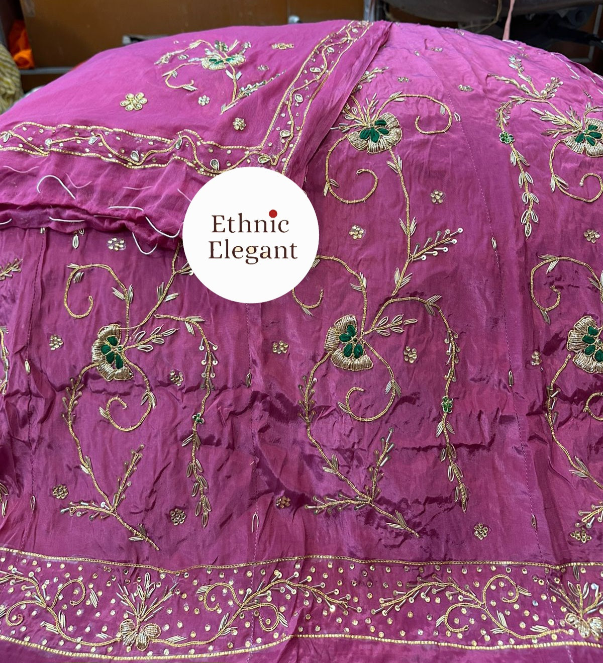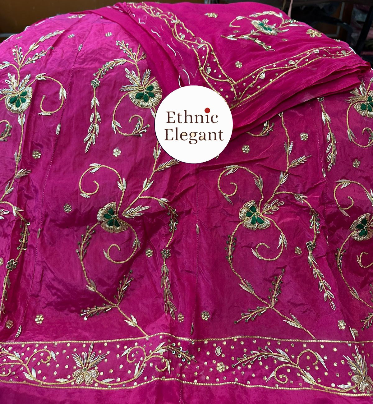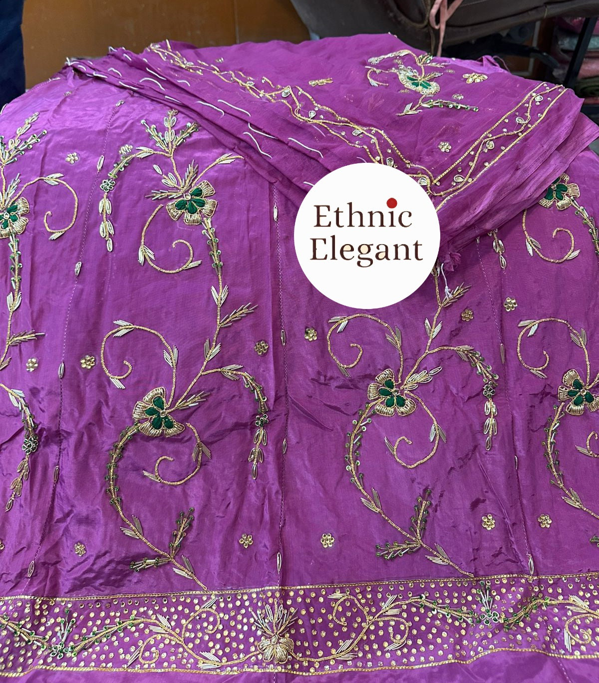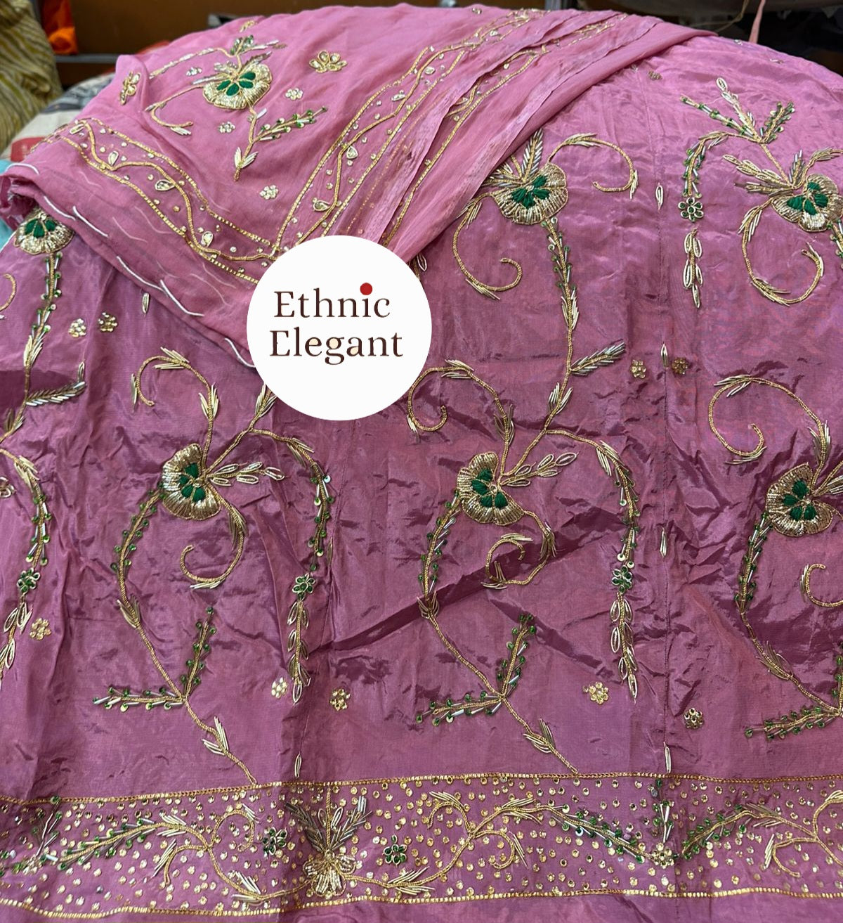 Handwork: Beautiful and heavy handwork featuring traditional Jardoji and Dabka techniques.