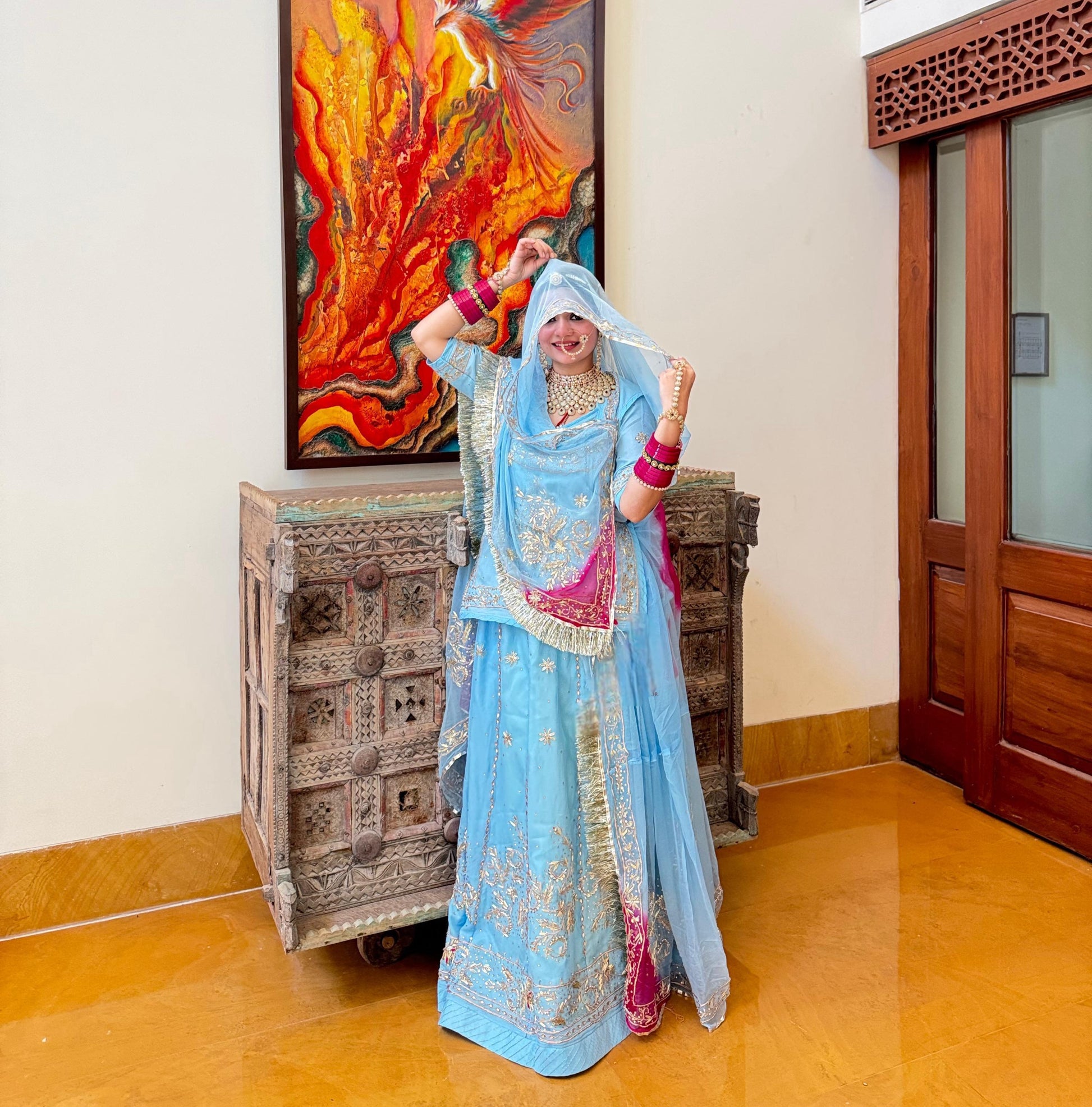 Natural fabric Elegant sky clour Zardoji handwork Rajasthani poshak