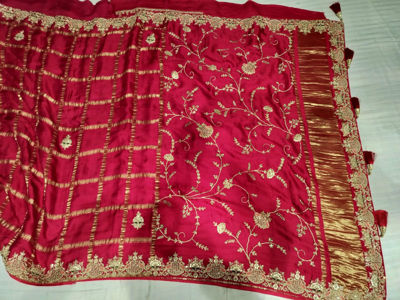 Bridal Pure Ghatchola Silk Saree – Calcutta elegant Hand Embroidery in Red Pink