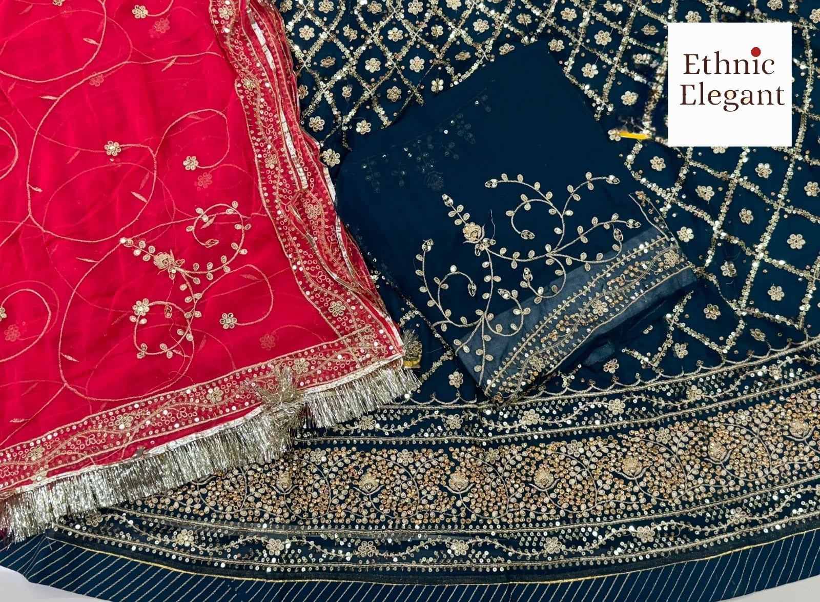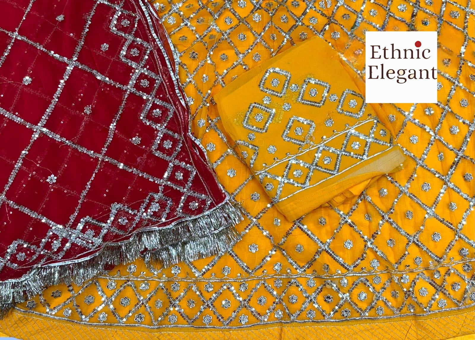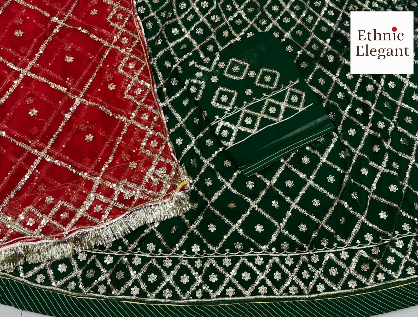 Crafted from premium half pure fabric, this elegant Rajputi Lehenga Poshak beautifully blends tradition and grace. The set includes a half pure orni (odhani) with a complete four-side matching work border, adding a regal touch to the attire.