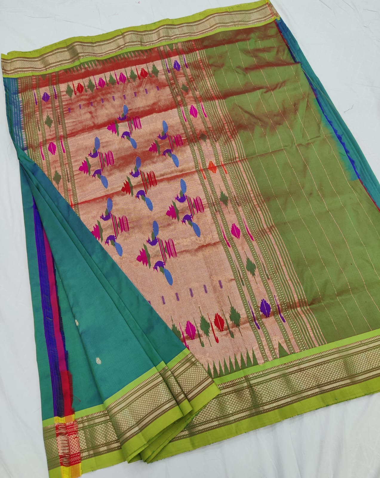 Various artisans in Maharashtra Yeola weave Paithani sarees for generations together, these are generally handcrafted with immense patience and intricate artwork. As Paithani silks are one of its kind, it takes 10 to 15 days to weave a saree, out of which 5 to 6 days are dedicated only to weave artwork on pallu. Each Yeola Paithani has its own story.