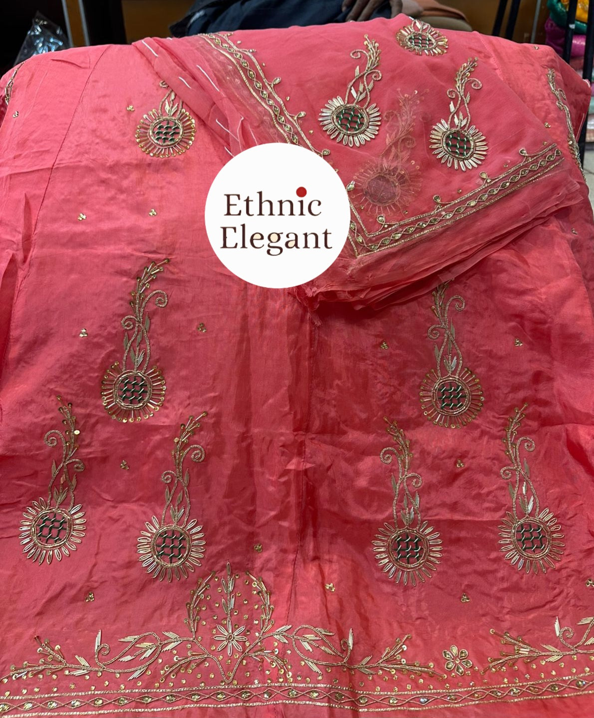 Handwork: Beautiful and heavy handwork featuring traditional Dabka and Jardoji techniques.